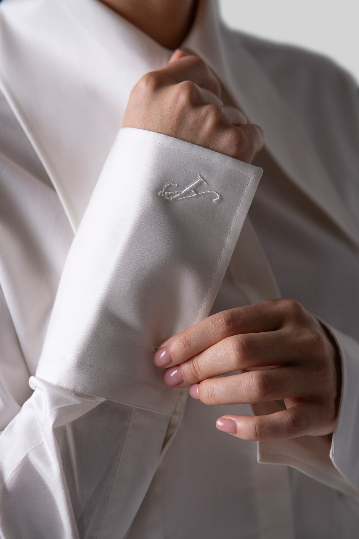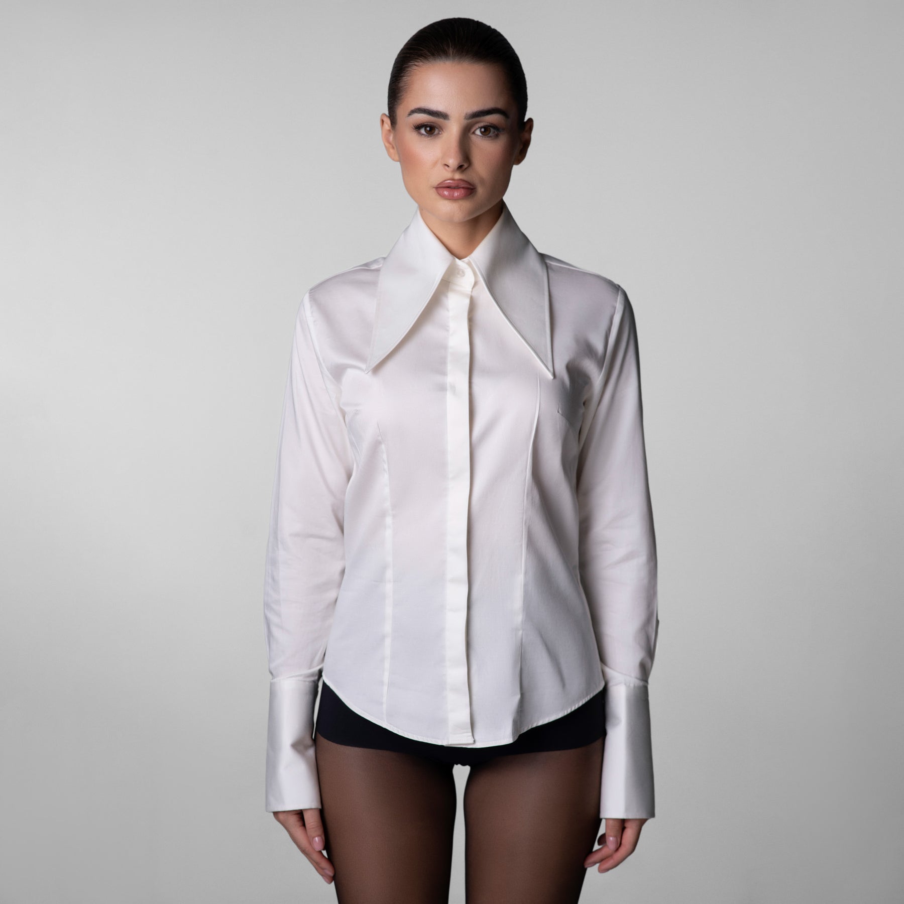 A timeless essential crafted from smooth satin, the Classic Shirt features an oversized pointed collar, concealed button placket, and elongated cuffs. Its tailored silhouette and curved hem make it versatile for both day and evening wear.