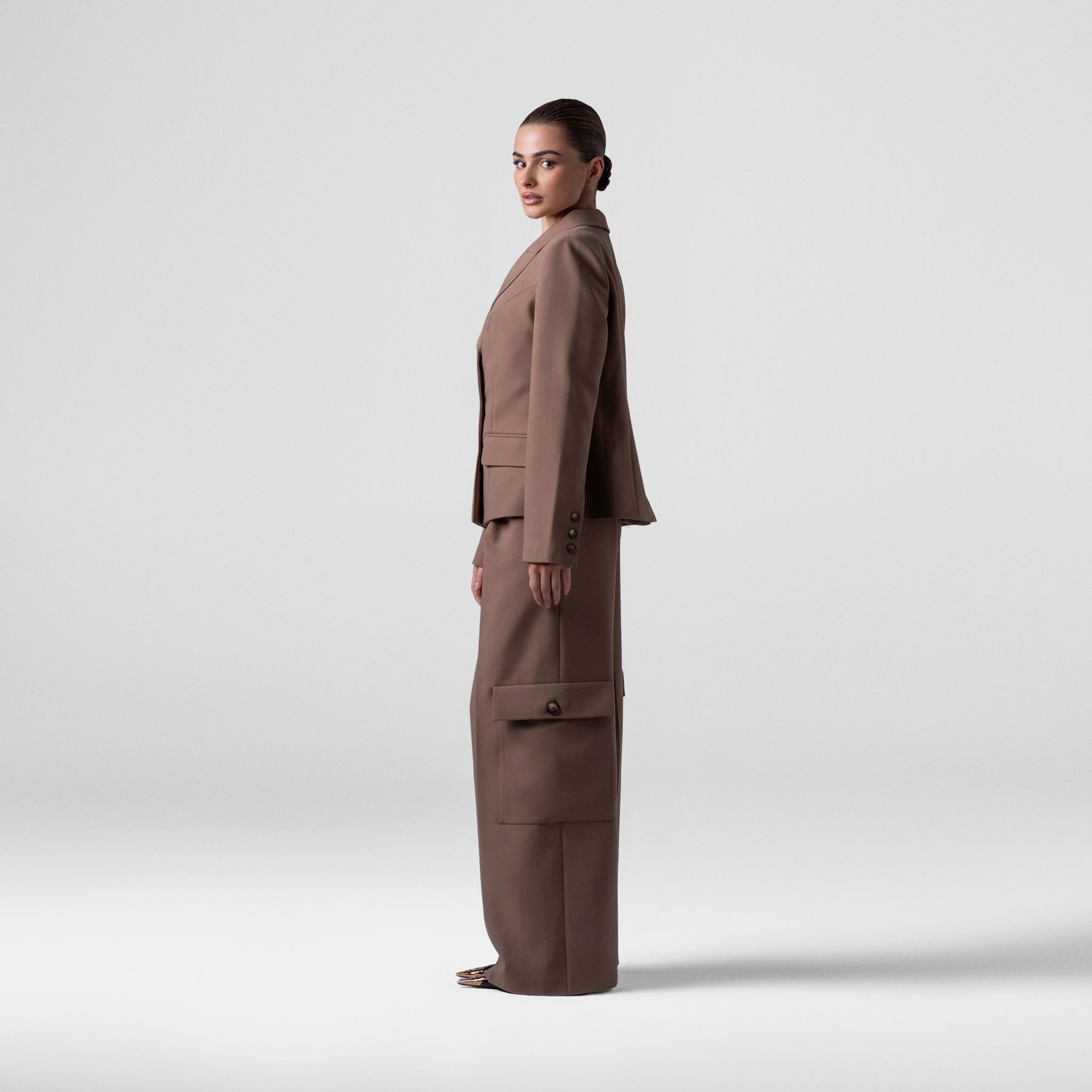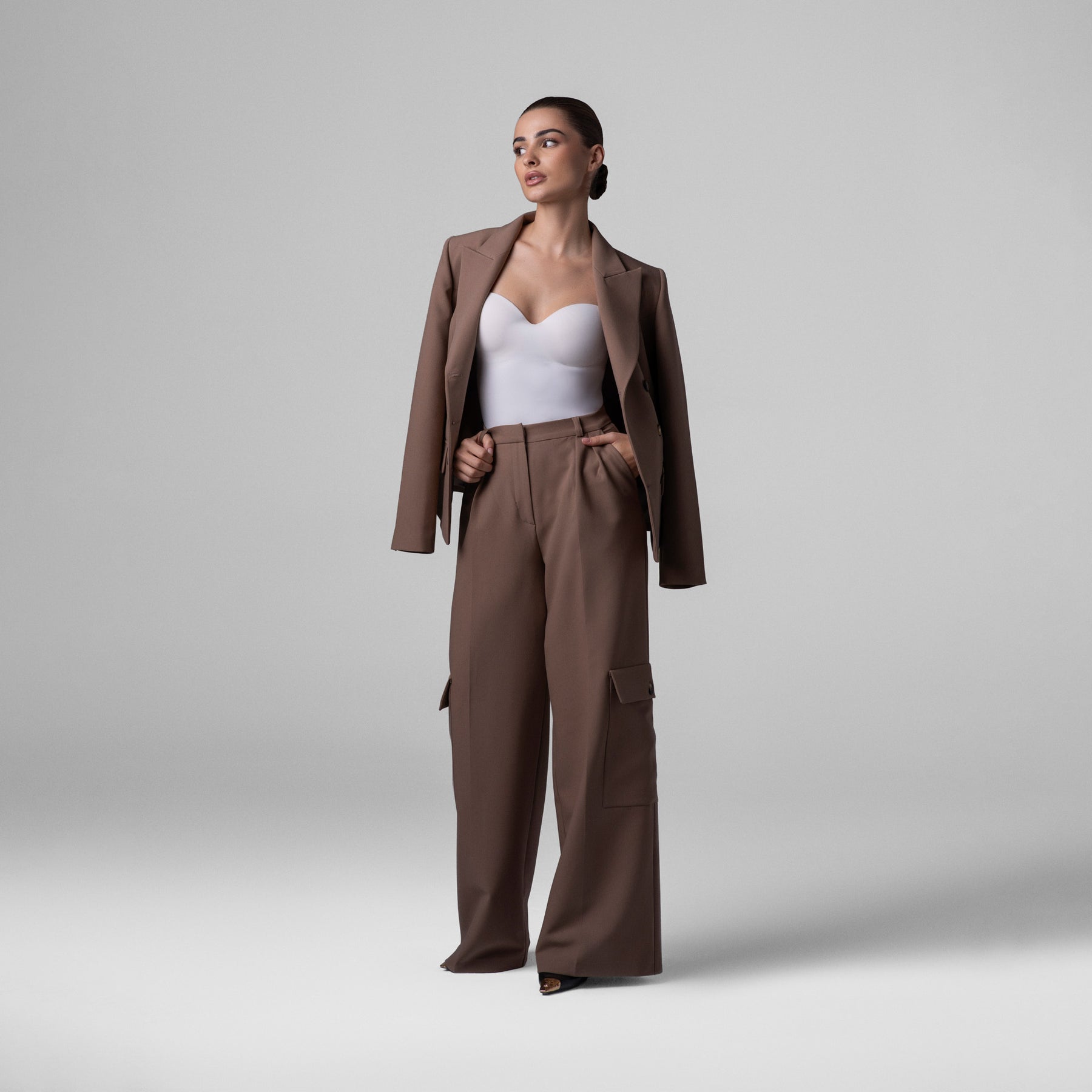 The Siena Suit is a modern reinterpretation of tailoring, combining a double-breasted blazer with wide-leg cargo trousers. Crafted from fine Italian wool with a touch of Lycra, the set balances structure with ease.