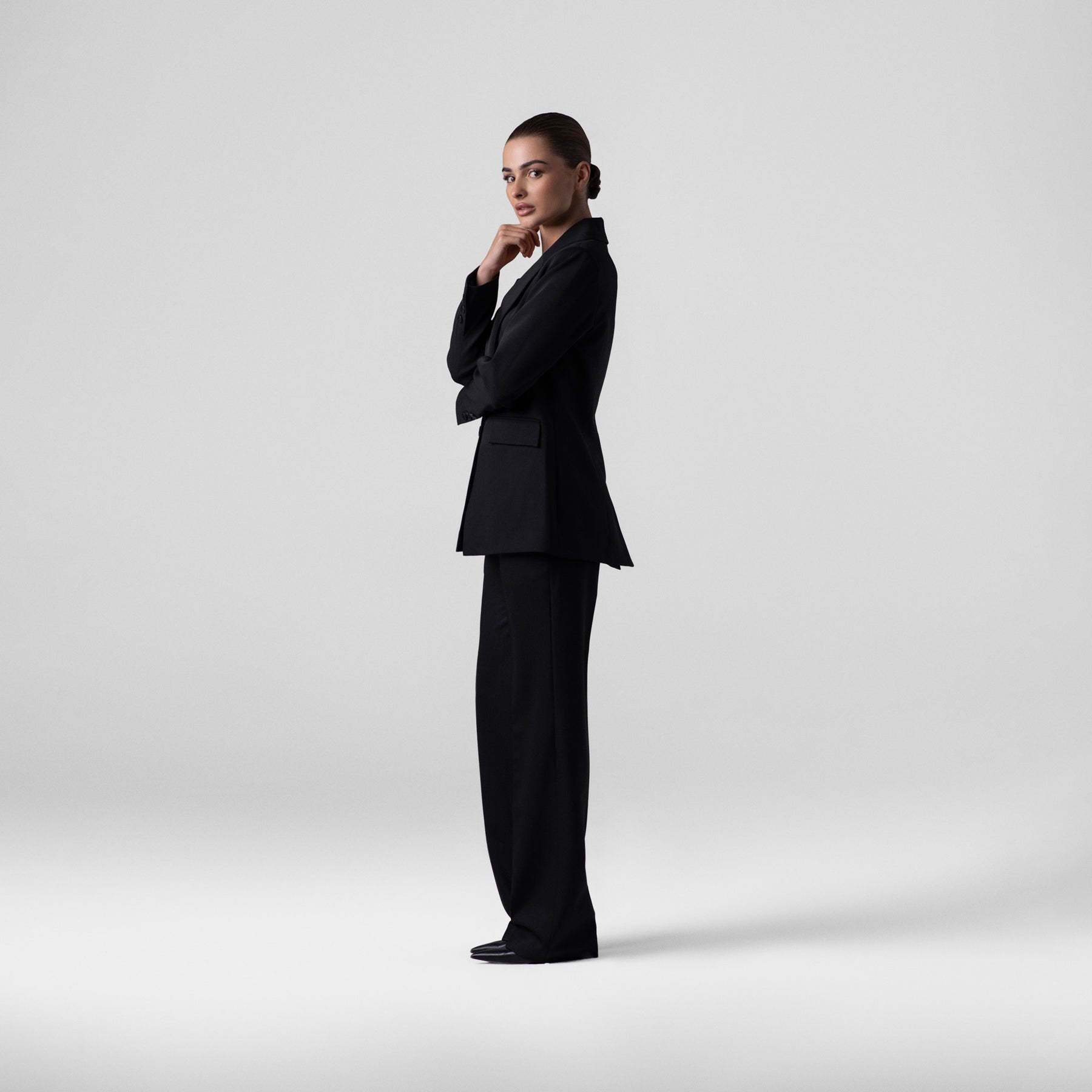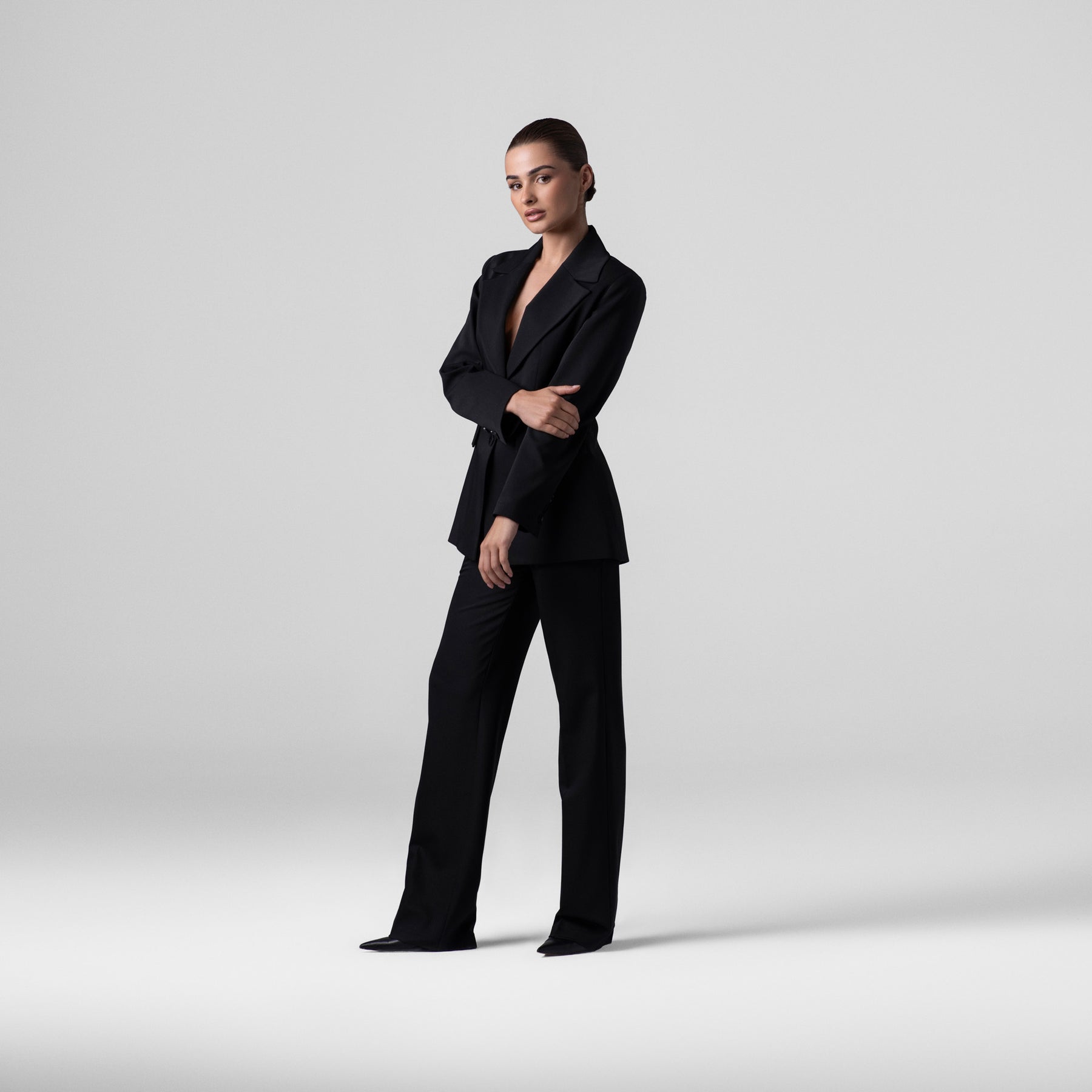 A refined matching set featuring a 2-button blazer and long tailored pants. Designed in premium wool with a touch of Lycra, it offers structure, comfort, and timeless sophistication for every occasion.