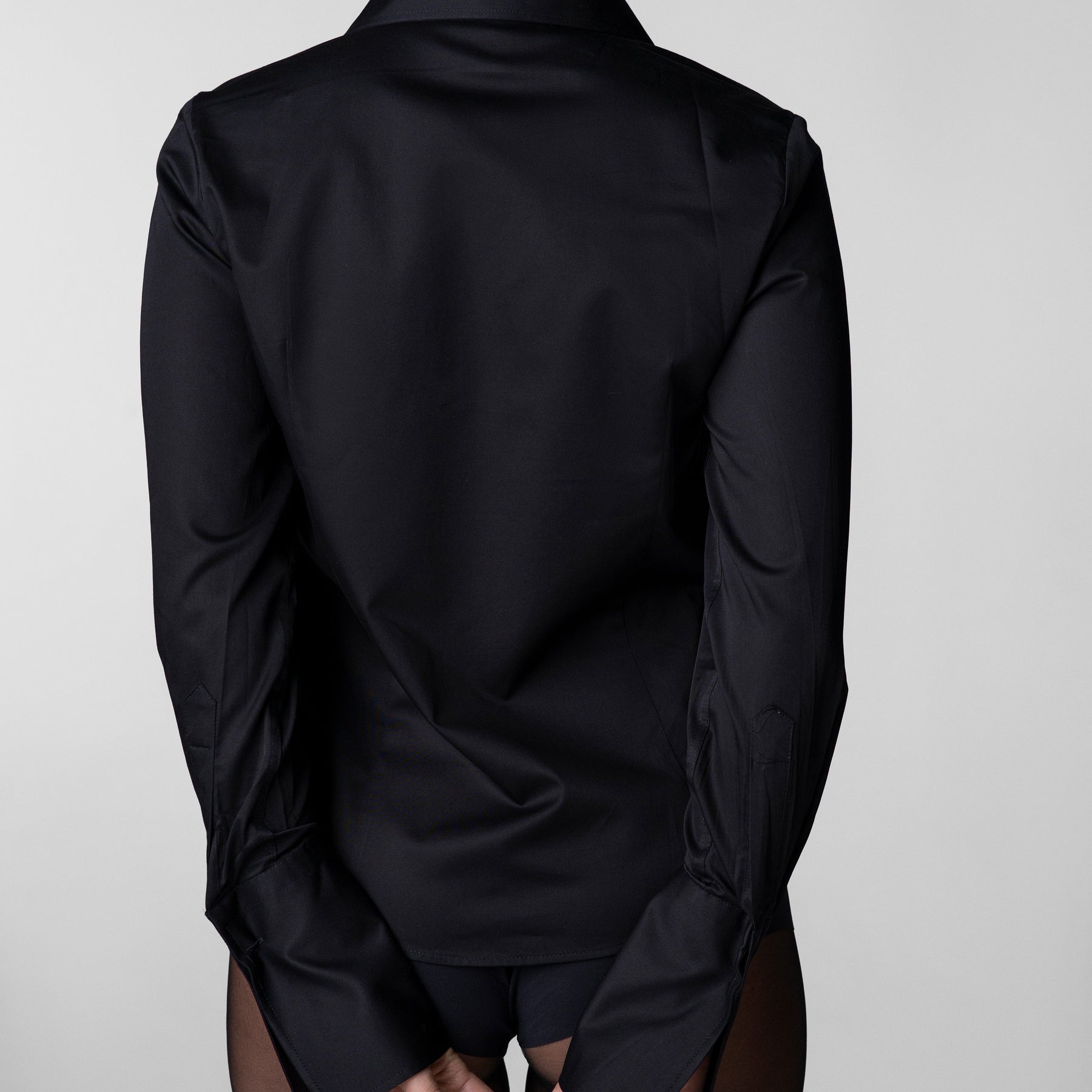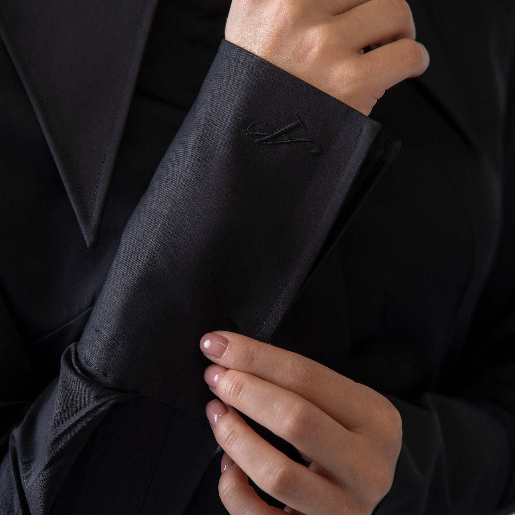 A timeless essential crafted from smooth satin, the Classic Shirt features an oversized pointed collar, concealed button placket, and elongated cuffs. Its tailored silhouette and curved hem make it versatile for both day and evening wear.