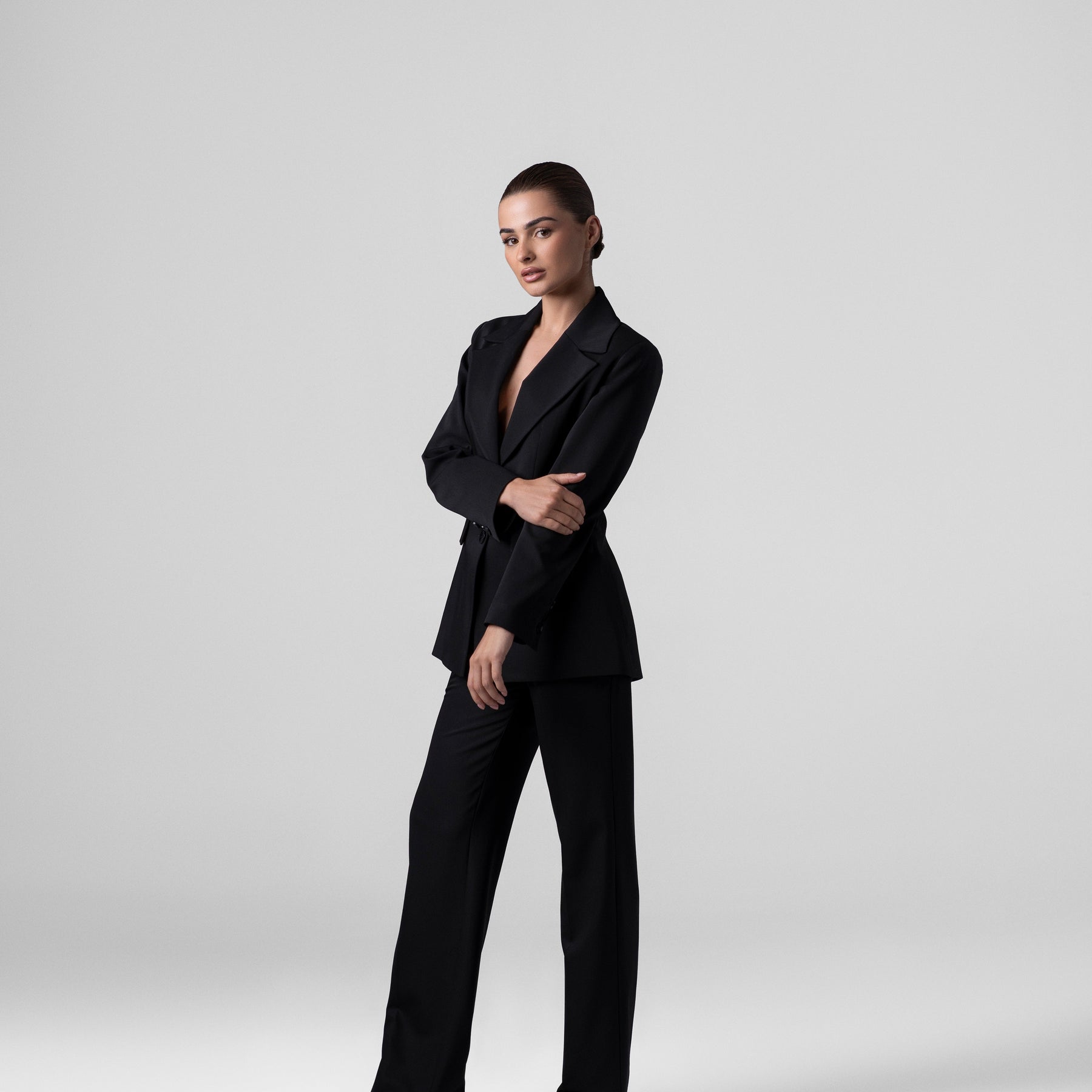 A refined matching set featuring a 2-button blazer and long tailored pants. Designed in premium wool with a touch of Lycra, it offers structure, comfort, and timeless sophistication for every occasion.
