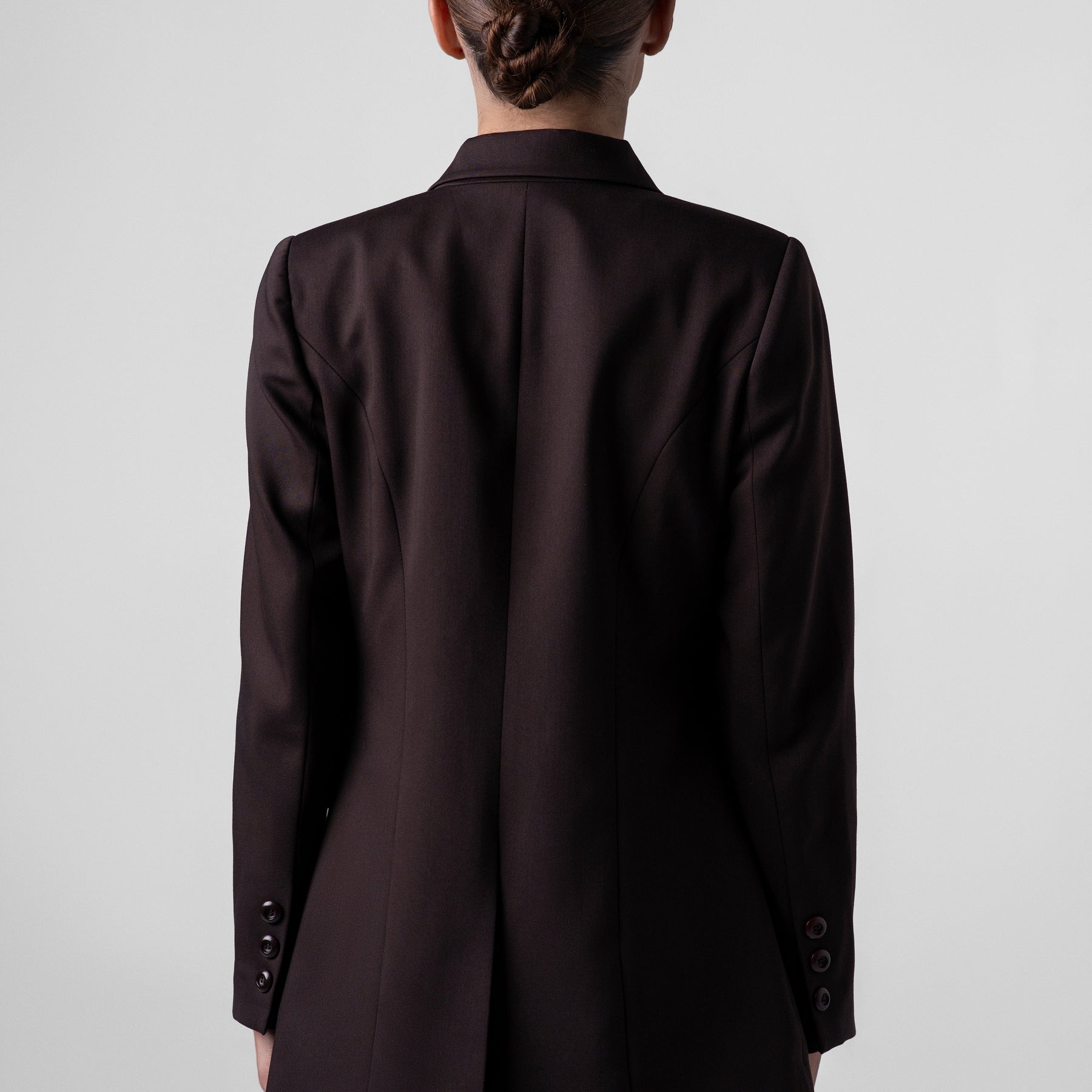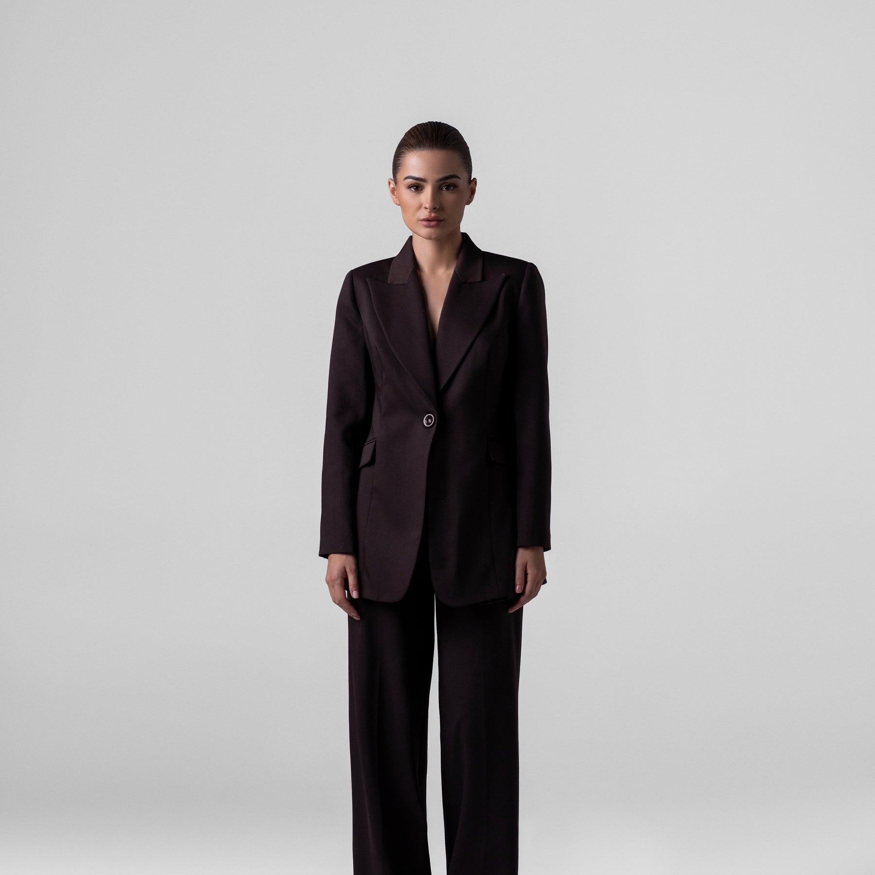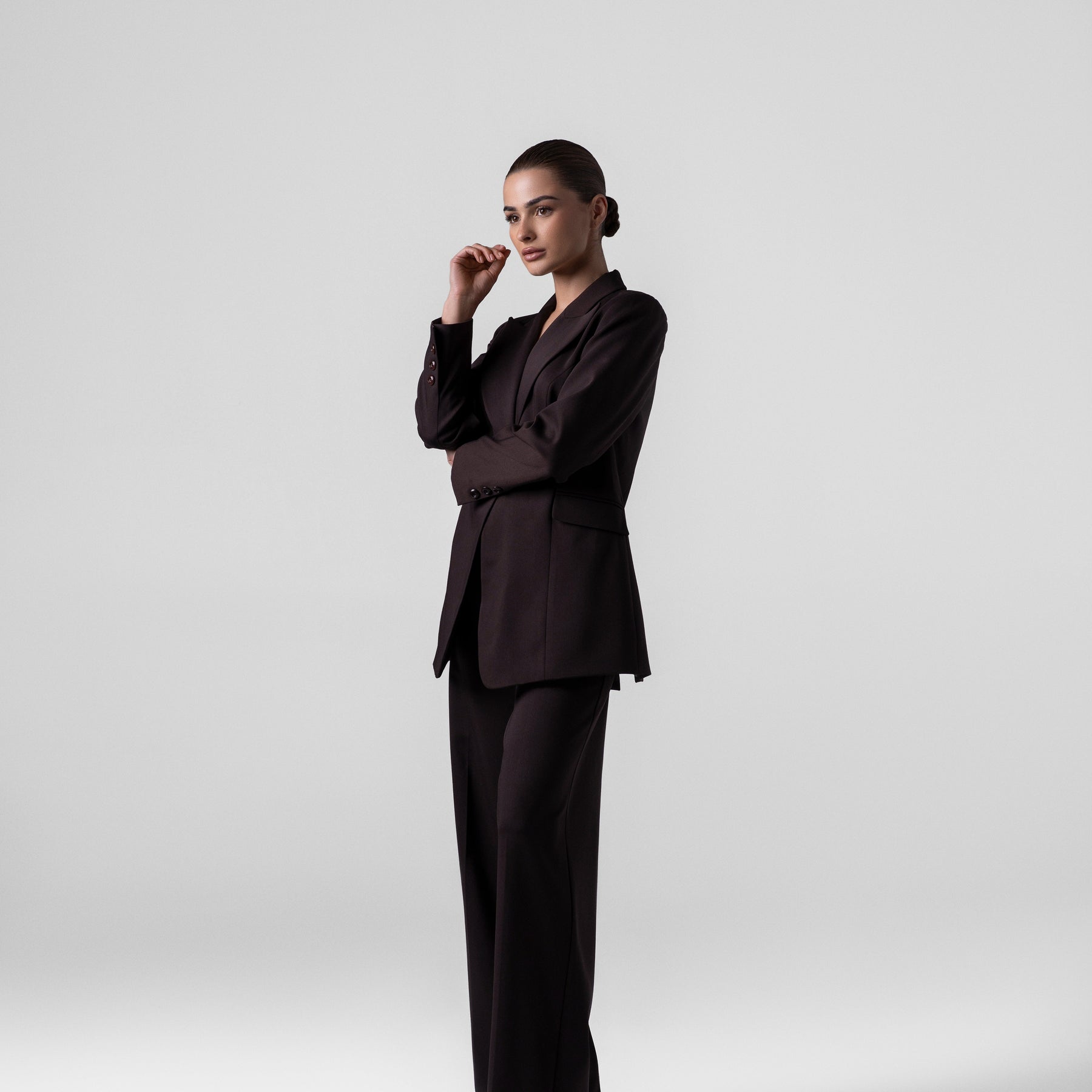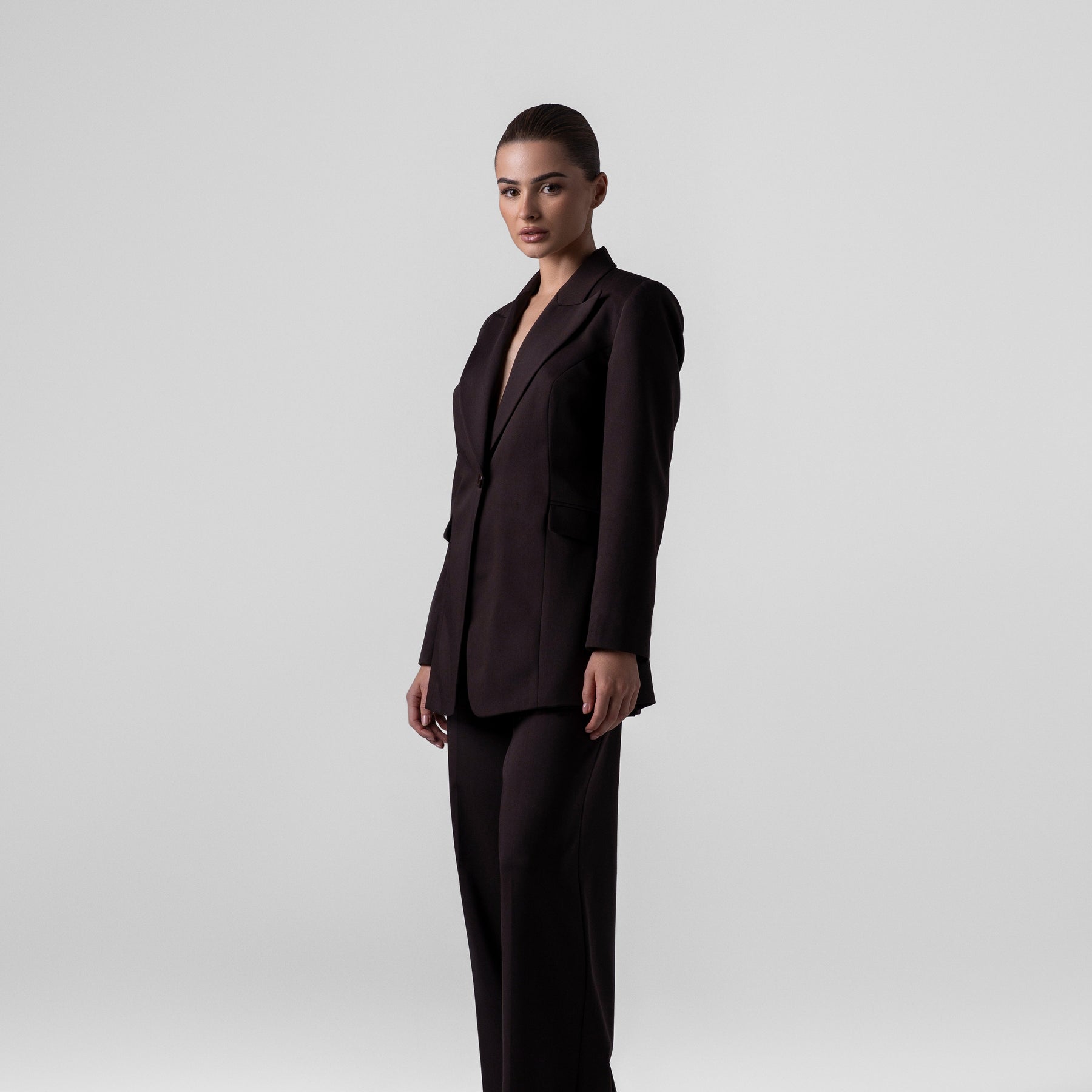 A timeless matching set featuring a one button blazer and long tailored pants. Crafted from fine wool with a touch of lycra it combines structure with effortless comfort for an elegant, everyday look.