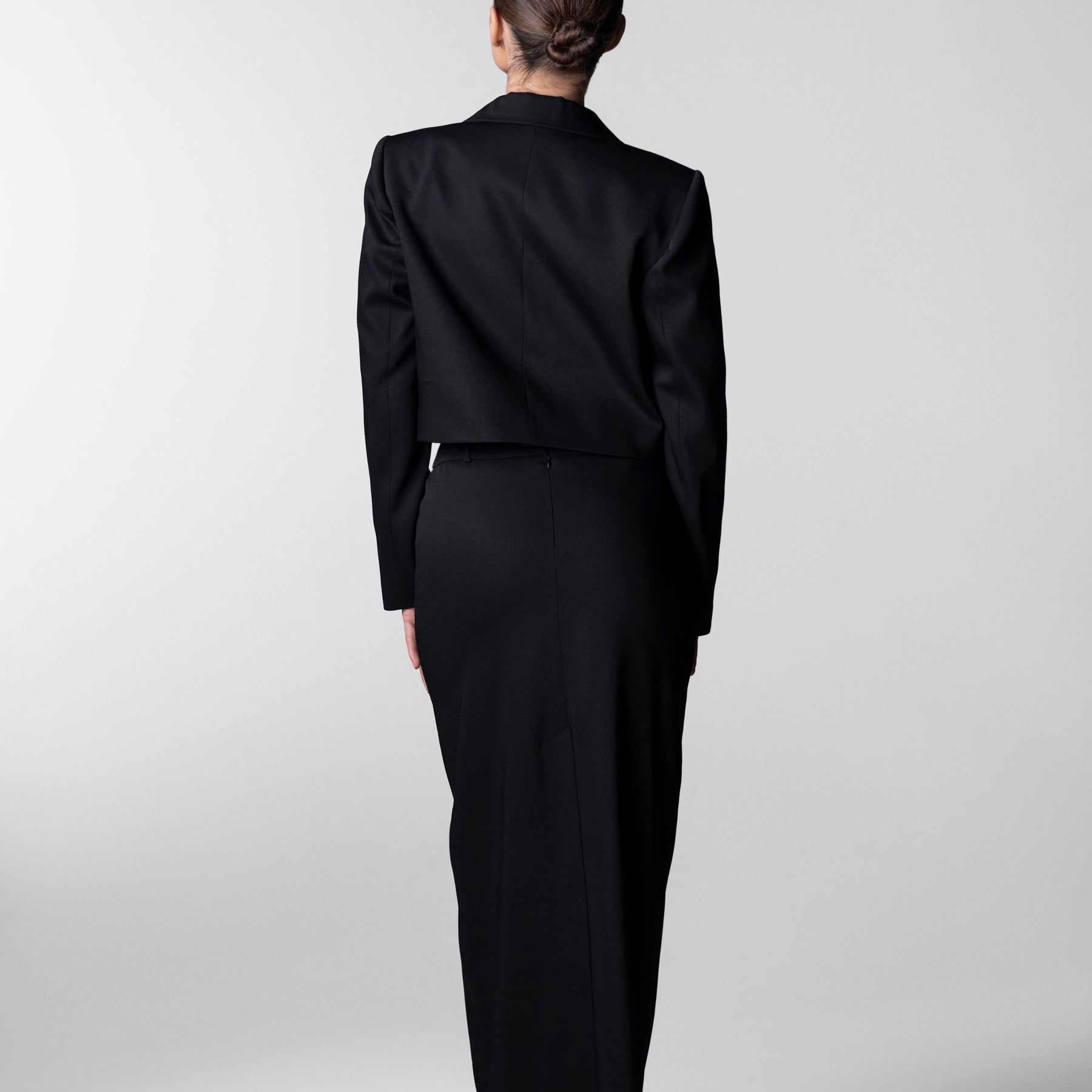 A modern two-piece set featuring a 1-button short blazer and a high-waisted maxi skirt. Tailored from fine wool with a touch of stretch, it offers sharp structure with refined comfort.